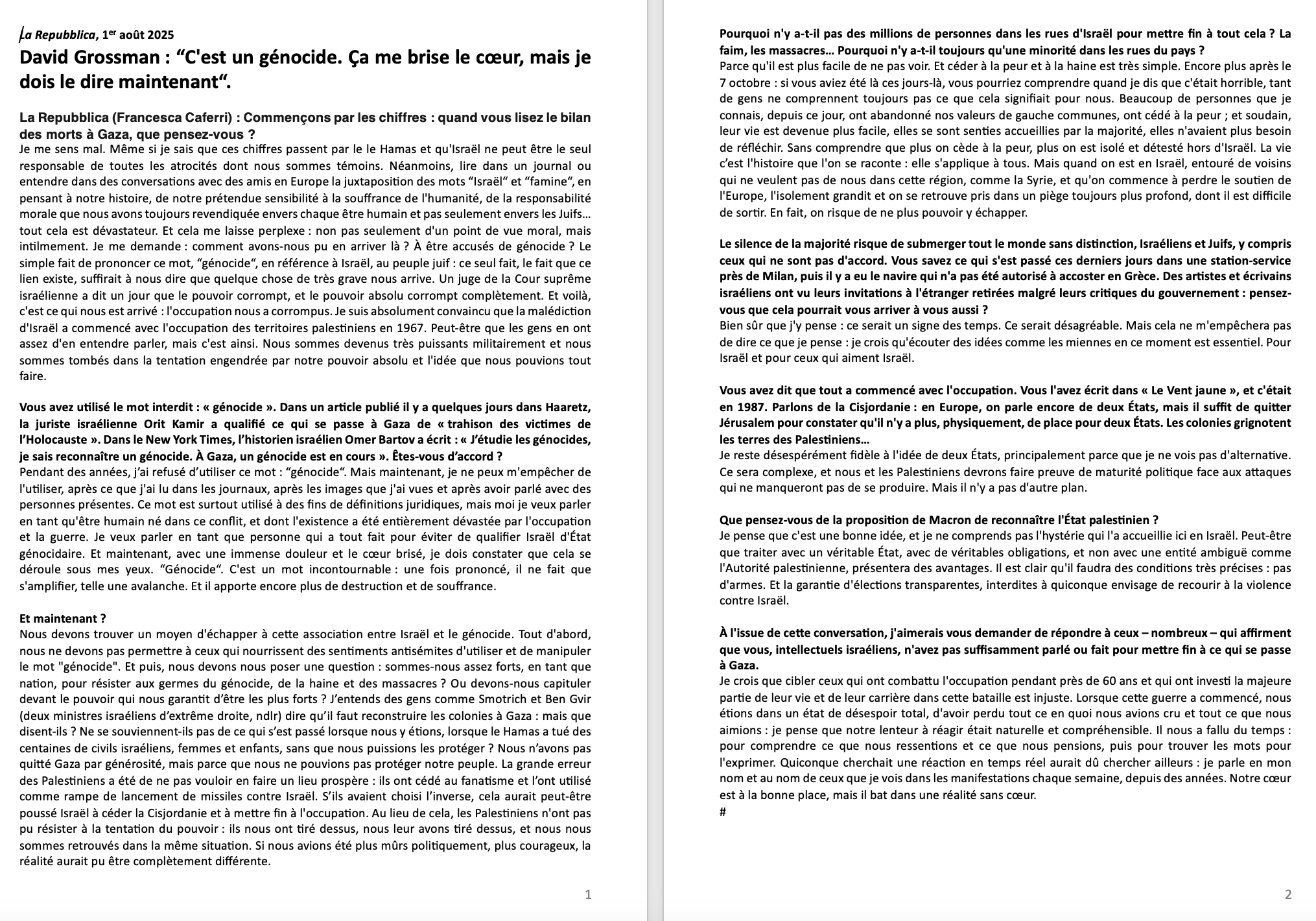 La mobilisation du côté israélien est fondamentale. Le courage des « Refuznikim » (ceux qui refusent de s’enrôler dans l’armée israélienne), du parti communiste israélien et des intellectuels comme les historiens de la Shoah (Omer Bartov, Amos Goldberg, Daniel Blatman, etc.) ou l’écrivain David Grossman mérite d’être salué. En effet, ils participent de la difficile contestation interne du suicide politique et moral d’Israël. On le sait, les images récentes d'otages ont constitué un nouveau choc. On le conçoit et le partage. Mais comment ignorer que Netanyahu tue deux fois les otages ? Une première, en les sacrifiant par son plan qui exclut toute solution négociée pour les libérer. Une deuxième, par la manière avec laquelle il assure au Hamas qui a commis le crime de guerre de les enlever un succès sur des décennies en refusant aux Palestiniens toute autre représentation politique. Surtout, comment la population israélienne parvient encore à être si sensible aux affamés Israéliens mais toujours aussi insensible aux affamés Palestiniens ? Le prisme colonial est si fort que même aujourd’hui, une large majorité d’Israéliens consent à l’écrasement de Gaza. De toute façon, ce pays est de moins en moins une démocratie, et cet état de fait ne fera que s’aggraver à mesure que la violence coloniale s’amplifiera. Au moins, ce front intérieur permet de montrer au monde juif hors d’Israël qu’une autre voie est possible et que l’aveuglement actuel et l’inhumanité qu’il implique ne sont pas une fatalité, comme il semble être le cas aujourd’hui. Subsidiairement, la dénonciation par des Juifs à travers le monde du génocide à Gaza et de ses causes antérieures prend de l’ampleur, et c’est indispensable à la fois pour les Palestiniens, les Israéliens et pour nous-mêmes. À ce titre, la lettre ouverte intitulée « Pas en notre nom » a rencontré ma pleine adhésion et me paraît être une étape importante puisqu’elle veut instituer un collectif large qui refuse de cautionner l’acte par lequel la représentation des Juifs en France soutient inconditionnellement le génocide. C’est un des combats difficiles à mener, et il se doit d’être large.